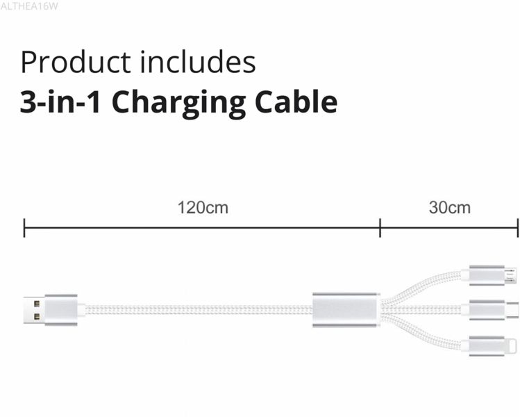 - Enthält ein 1,5 m langes 3,0A 3-in-1-Kabel (Micro-USB, USB-C, Lightning 8-Pin)