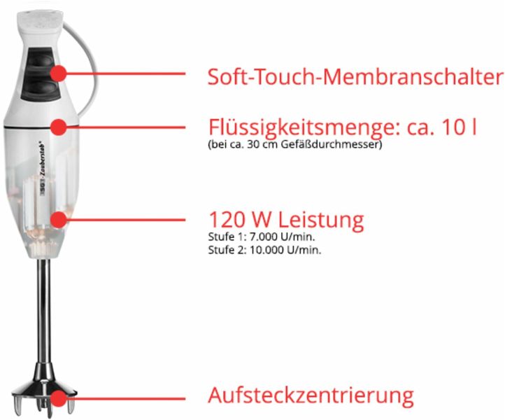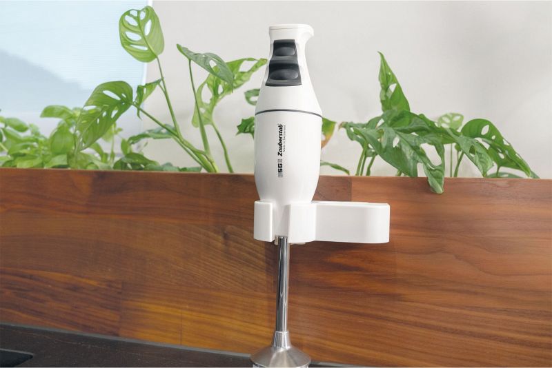 Mit dem Einsteigermodell aus der großen ESGE-Zauberstab®-Familie geht's ganz leicht: mixen, pürieren, zerkleinern - alles ganz easy. Zum praktischen Zubehör gehören Multifunktionsmesser, Wandhalter und eine ausführliche Rezeptanleitung. Mit 120 Watt Leistung ist der ESGE-Zauberstab® M 100 D White stark genug, um Obst, Gemüse und was sonst noch so zerkleinert werden soll, die Zähne zu zeigen. Bei 7.000 oder 10.000 Umdrehungen in der Minute wird alles so verarbeitet, wie es sich Küchenfeen und angehende Hobbyköche wünschen. Die Aufsteckzentrierung macht das exakte Positionieren des ESGE-Multifunktionsmessers zum Kinderspiel.