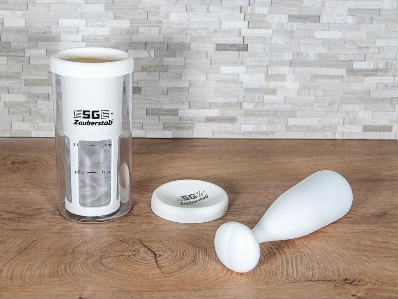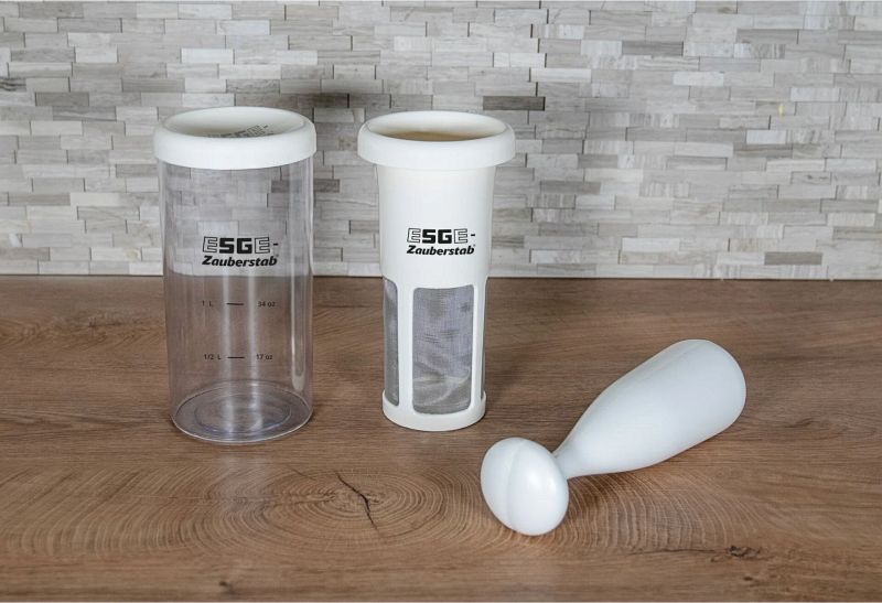 Filter (12 x 23,5 cm) | Mörser (6,8 x 26,2 cm) | Behälter mit Deckel (11,5 x 22,8 cm) | Farbe: grau / transparent | Material: Kunststoff