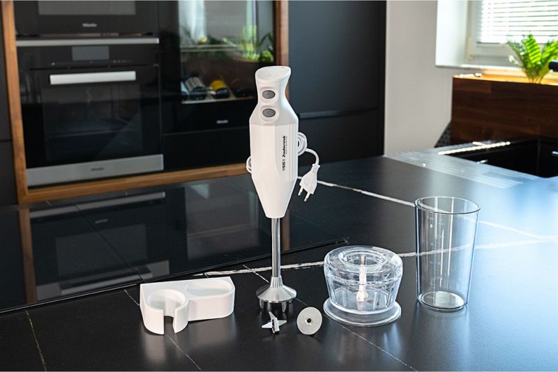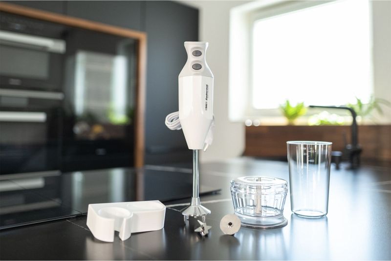 Das ist ein Traumpaar! Der ESGE-Zauberstab® M 122 De Luxe und der ESGE-Zerkleinerer sind als Team unschlagbar! Der Stabmixer ist mit Multimesser und Schlagscheibe fürs Zerkleinern, Pürieren, Hacken, Emulgieren und beim Steifschlagen von Sahne und Eiweiß bestens ausgestattet, der Zerkleinerer, auf den der ESGE-Zauberstab® M 122 De Luxe einfach aufgesetzt wird, verwandelt Würfelzucker, Schokolade, Nüsse, Gewürze und Co. im Handumdrehen in feines Pulver. Dafür sorgt ein zweiflügeliges Messer - und damit nichts verrutscht, hat der Zerkleinerer einen standsicheren Gummifuß. Der ESGE-Zauberstab® M 122 De Luxe bietet mit seinem leistungsfähigen AC-Motor zwei Stufen - 10.000 und 14.000 Umdrehungen pro Minute, die Power für alle Fälle!Verstärkt wird das Duo durch die praktische Wandhalterung für den ESGE-Zauberstab® M 122 De Luxe, so ist er immer griffbereit. Und der zum Rundum-sorglos-Paket gehörende 600ml-Mixbecher ist ideal für die Zubereitung von Mayonnaise oder zum Aufmixen eines würzigen Dressings.
