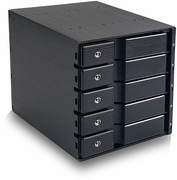 SAS (12G) + SATA (6G) Backplane für 5x 3,5" HDD in einem 3x 5,25" Einschub mit einem 80 mm Lüfter an der Rückseite.