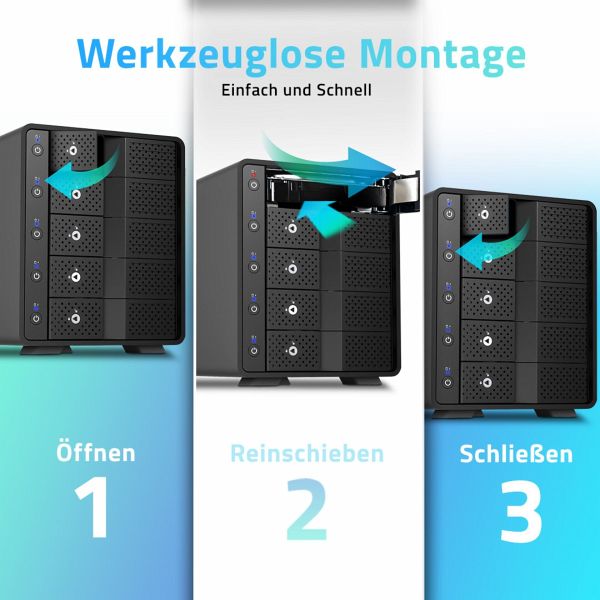 - Werkzeuglose Montage: einfaches Einsetzen der Festplatten, kein Werkzeug notwendig