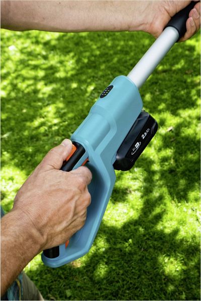 Die Teleskop-Schere wiegt mit eingesetztem Akku 3,4 Kilogramm; ihr Griff ist ergonomisch geformt, und sie hat einen optimalen Schwerpunkt. Dadurch liegt sie auch dann ruhig und sicher in Deiner Hand, wenn der Teleskopstiel voll ausgezogen, weil Du die kompletten drei Meter Reichweite ausschöpfen willst.