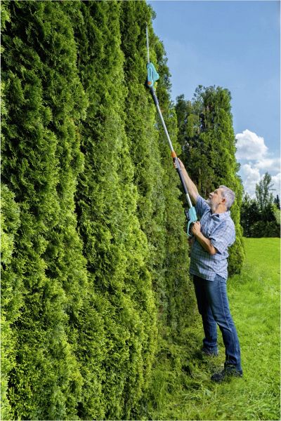 Hohe Hecken schützen die Privatsphäre. Müssen sie geschnitten werden, wünscht man sich dann aber schnell, man würde nicht gar so viel Wert auf Sichtschutz legen, denn dann hätte man es leichter. Es sei denn, man setzt auf die GARDENA Akku-Teleskop-Heckenschere THS 42/18V P4A. Mit ihr sind selbst drei Meter hohe Hecken kein Problem. Das Schneiden auf wackeligen Leitern gehört der Vergangenheit an, man kann mit beiden Beinen stets sicher auf festem Boden stehen und muss zudem auf kein Stromkabel achten.