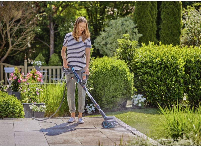Die GARDENA Akku-Multibürste AquaBrush Patio 18V P4A eröffnet Haus- und Gartenbesitzern vielfältige Einsatzmöglichkeiten für die effiziente Nassreinigung auf Knopfdruck. Dank des ergonomisch verstellbaren Handgriffs lassen sich Reinigungs- und Pflegearbeiten besonders einfach und komfortabel erledigen. Durch ihren modularen Aufbau ist die AquaBrush 18V P4A sehr flexibel einsetzbar. Je nach Bedarf kann mit dem Verlängerungsgriff der Boden gereinigt werden, ohne Verlängerungsgriff mit dem Bürstenaufsatz direkt am Handstück können senkrechte Objekte gereinigt werden. Die Walzenbürste rotiert auf Knopfdruck und reinigt Flächen schonend und gründlich. Mit der Walzenbürste Universal für unempfindliche Flächen werden auch hartnäckige Verschmutzungen zuverlässig entfernt, z. B. auf Pflasterflächen in Hofeinfahrten. Durch die seitlichen Borsten werden auch die Randbereiche entlang von Bordsteinen sauber. Der integrierte Spritzschutz sorgt dafür, dass die Umgebung sauber bleibt. In engen Bereichen, auf Treppenstufen oder empfindlichen Oberflächen kommt die sanft rotierende Tellerbürste Soft zum Einsatz. Wird die AquaBrush 18V P4A mit der Tellerbürste Soft verwendet, kann diese ohne Stiel direkt am Griff montiert werden. Dies ist besonders praktisch bei der Reinigung von Gartenmöbeln, Balkongeländern, Zäunen und anderen senkrechten Flächen. Der Bürstenwechsel ist mit wenigen Handgriffen und ohne Werkzeug möglich. Der Tellerbürsten-Aufsatz für die AquaBrush ist auch für den Einsatz mit handelsüblichen Polierpads geeignet. Der GARDENA Akku-Multi Reiniger verfügt über einen Gartenschlauchanschluss am Handgriff. Über ein Regulierventil kann der Wasserverbrauch stufenlos eingestellt werden. Auch die Geschwindigkeit des Akku-Multi-Reinigers AquaBrush lässt sich individuell einstellen. Der verbleibende Akku-Ladezustand wird über die LED-Anzeige im Handgriff gut sichtbar angezeigt. Der benötigte 18 Volt System-Akku passt auch in eine Vielzahl anderer Gartengeräte von GARDENA, ist aber nicht im Lieferumfang enthalten.