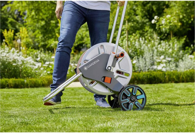 Der speziell geformte, ausklappbare Standfuß gewährleistet eine hohe Standsicherheit. Diese erleichtert das Bewässern, denn der Schlauchwagen hält auch stand, wenn man am Schlauch zieht.