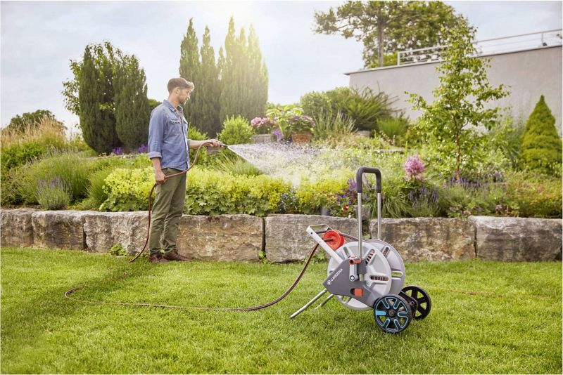 Der Nachtropfstopp sorgt dafür, dass nach dem Gebrauch oder beim Transport des Schlauchwagens kein Wasser ausläuft.
