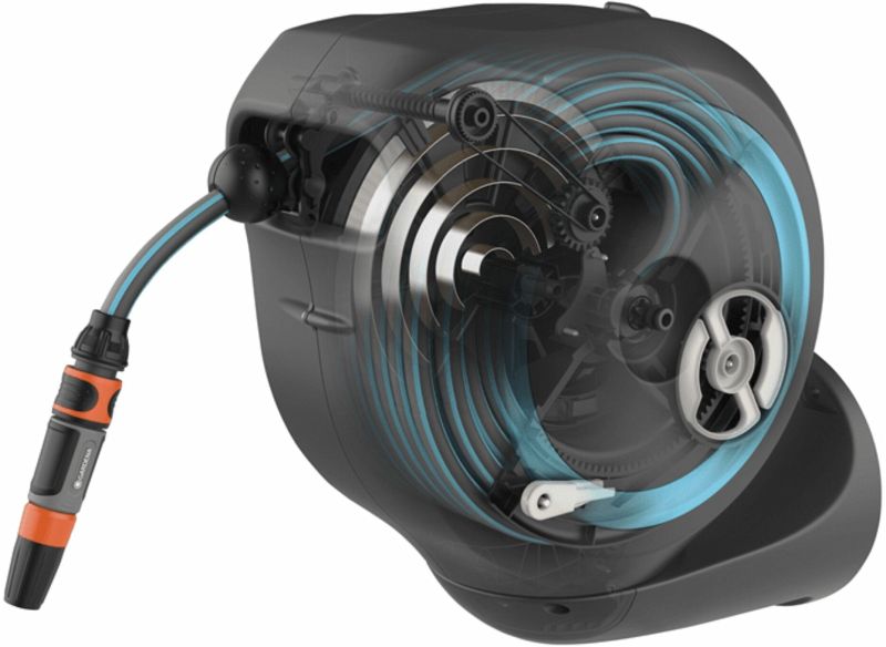 Mit einem leichten Zug am Schlauchende löst Du die Arretierung und eine eingebaute Stahlfeder mit einer innovativen RollControl-Technologie sorgt für einen gleichmäßigen und kontrollierten Rückzug. Die RollControl-Technologie gewährleistet ein langsames und sicheres Zurückziehen, unabhängig davon, wie weit der Schlauch abgewickelt ist.