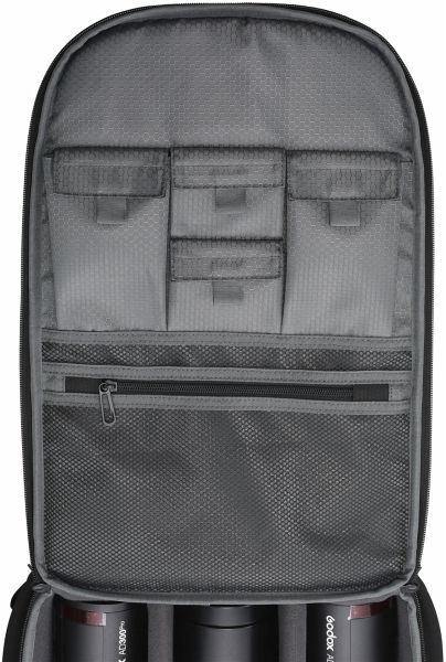 Godox CB20 ist ein geräumiger und funktionaler Rucksack. Sein äußerer Teil besteht aus einem leichten und glatten Nylongewebe, das wasserdicht und verschleißfest ist. Die innere Schicht besteht aus einem Polyesterwabenfutter.