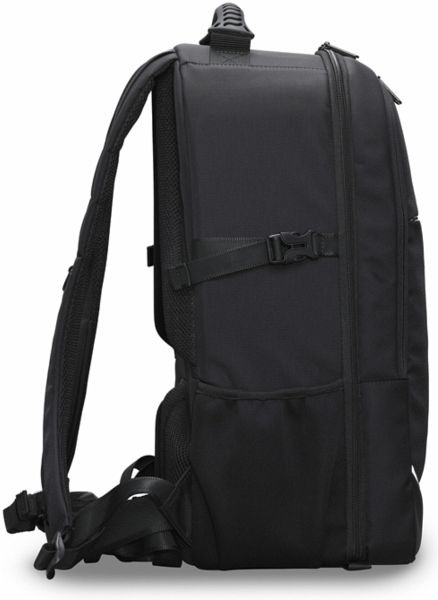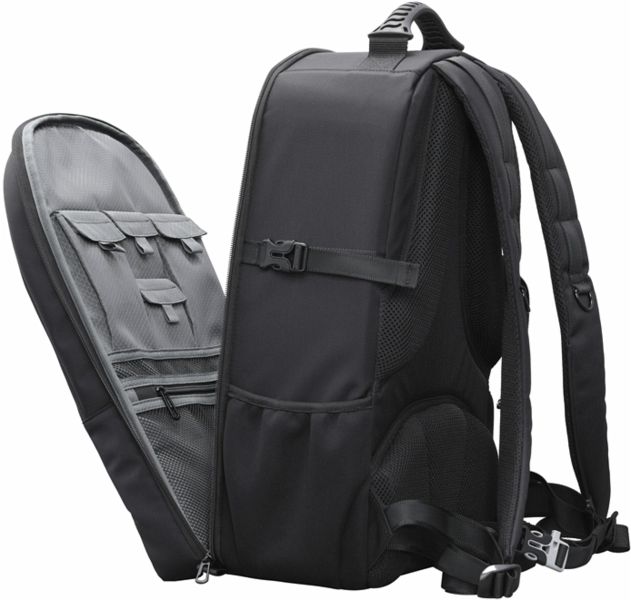 Rundumreißverschlüsse bieten Zugang von allen Seiten. Er hat auch einen abnehmbaren stabilisierenden Hüftgurt. Das vordere Fach bietet Platz für einen 15-Zoll-Laptop. Er hat Seitentaschen für ein kleines Stativ und eine Softbox sowie vier geschlossene Taschen und eine Netztasche für zusätzlichen Stauraum. Am Rucksack ist ein reflektierender Streifen angebracht, um die Sichtbarkeit beim nächtlichen Gehen zu verbessern.