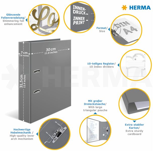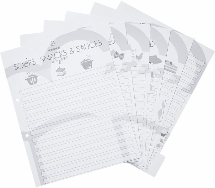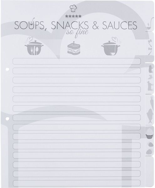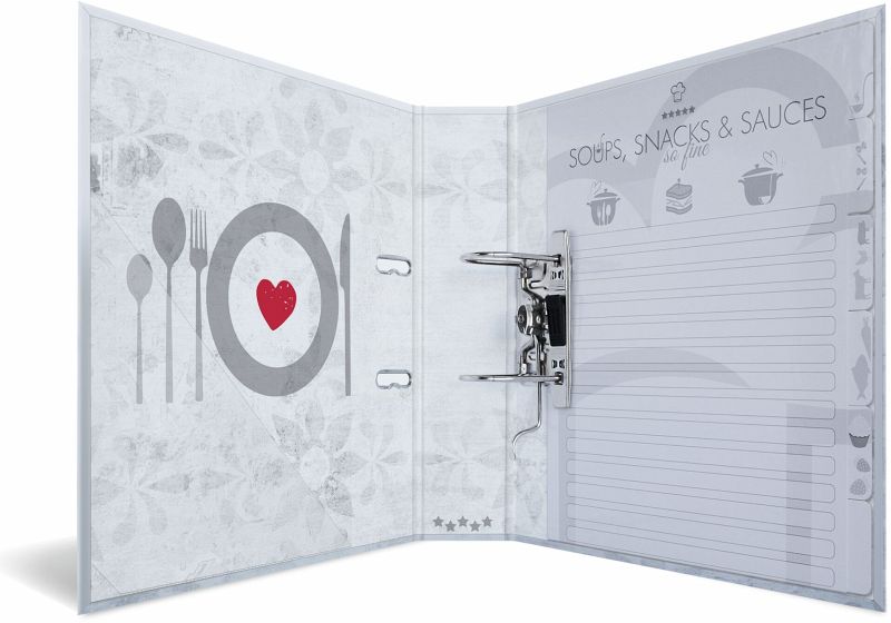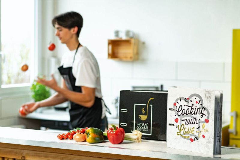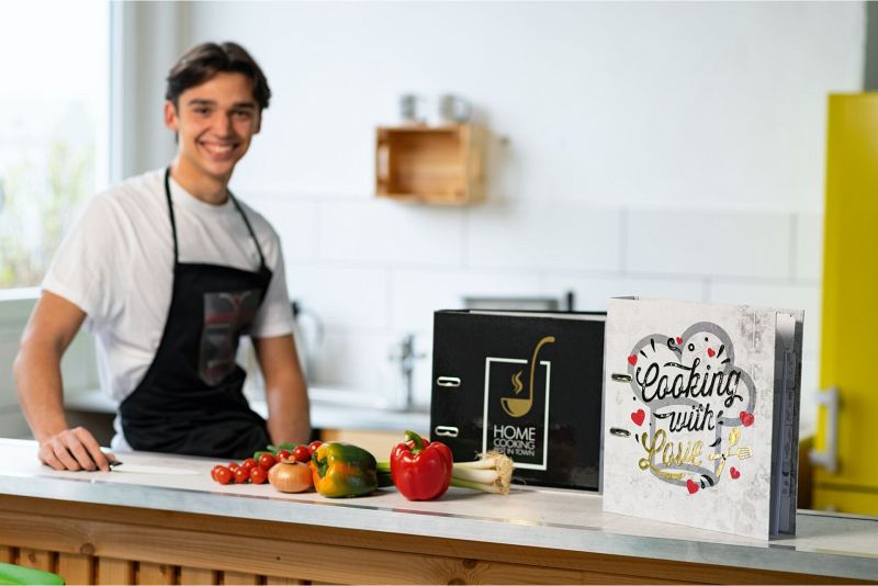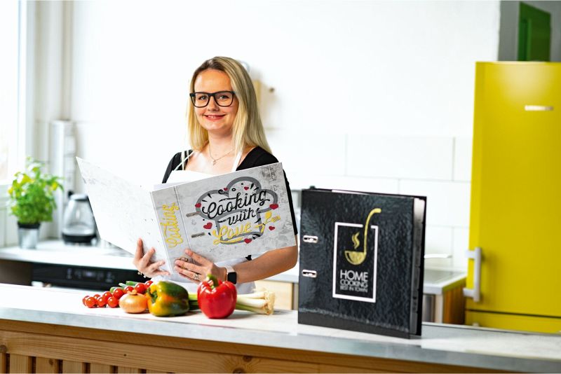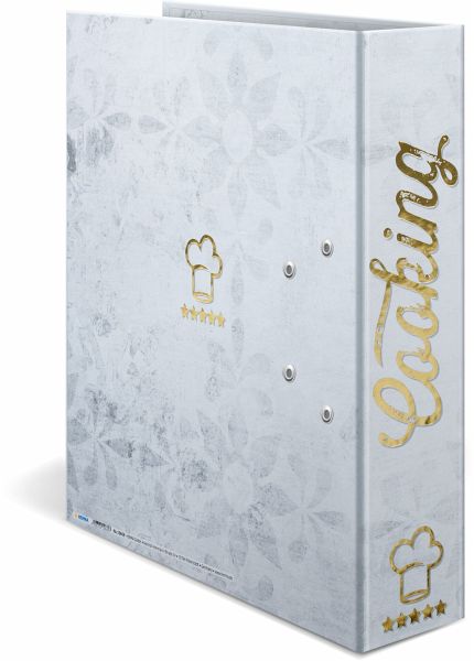 Viel Platz für die liebsten Back- und Kochrezepte bietet der HERMA Motiv-Ordner "Cooking with Love" im Format DIN A4, passend für alle Klarsichthüllen mit Standardlochung. So bleiben Rezepte gut geschützt vor Spritzern und Fingerabdrücken. Mit dem praktischen 6-teiligen Register lassen sich Rezepte, Ideen, Tipps und Tricks leicht einordnen und wieder finden. Das Register ist unterteilt in "Soups, Snacks & Sauces", "Pasta & Co.", "Meat", "Veggies" "Seafood", "Dessert" sowie einer freien Seite zum selbst beschriften. Ideal für alle, die gerne kochen, in der Küche Neues ausprobieren oder einfach mal herumexperimentieren möchten. Der dekorative Ordner im hellen Design ist aus stabilem Karton gefertigt, hat eine hochwertige Hebelmechanik mit Niederhalter und ist mit Goldfolie veredelt - ein Hingucker im Küchenregal. Besonders clever: die aufgeklebte Einstecktasche auf der Innenseite für wichtige Notizen und mehr.