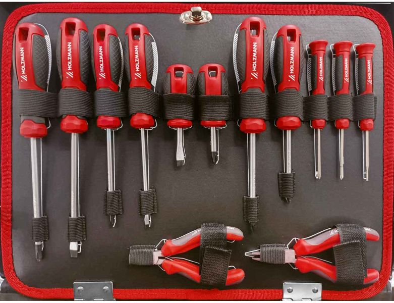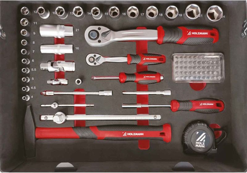 Der HOLZMANN WZK119ECO Werkzeugkasten enthält ein 119-teiliges Werkzeugset, das übersichtlich auf vier Fächer verteilt und in einem kompakten Koffer mit Tragegriff ordentlich verstaut ist.