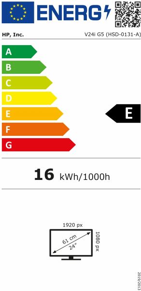 Marke: HPModellkennung: V24i G5 (HSD-0131-A)Energieeffizienzklasse von A (höchste Effizienz) bis G (niedrigste Effizienz): ELeistungsaufnahme im Ein-Zustand (kWh/1000h): 16Energieeffizienzklasse im HDR-Modus von A (höchste Effizienz) bis G (niedrigste Effizienz): -Leistungsaufnahme im Ein-Zustand im HDR-Modus (kWh/1000h): -Sichtbare Bildschirmdiagonale (cm): 61Sichtbare Bildschirmdiagonale (Zoll): 24Bildschirmauflösung (Pixel): 1920 x 1080