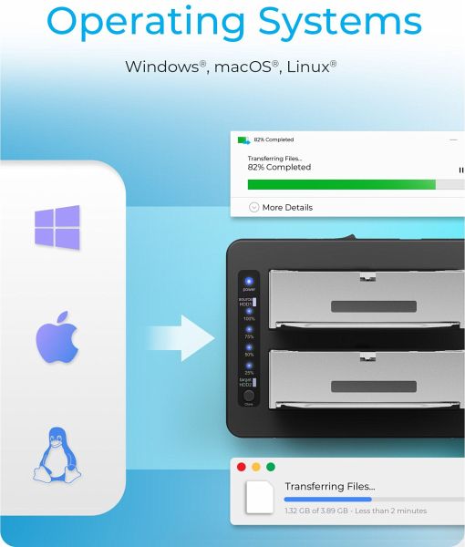 Klonen Sie Ihre Quellfestplatte ganz einfach auf eine größere Zielfestplatte, ohne dass Sie einen Computer anschließen müssen. Dank der LEDs, die den Fortschritt in Echtzeit anzeigen (von 25 % bis 100 %), können Sie jeden Schritt des Prozesses überwachen. Dies ermöglicht ein einfaches und zuverlässiges Klonen.