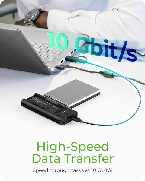 Erzielt schnelle Datenübertragungsgeschwindigkeiten von bis zu 10 Gbit/s über die USB 3.2 Gen 2 Type-C Schnittstelle und gewährleistet so schnelle Backups und effiziente Dateiübertragungen. Ganz gleich, ob Sie große Multimediadateien verschieben, wichtige Daten sichern oder auf hochauflösende Bilder und Videos zugreifen möchten - dieses SSD-Gehäuse bietet eine Leistung, die Ihnen wertvolle Zeit spart.