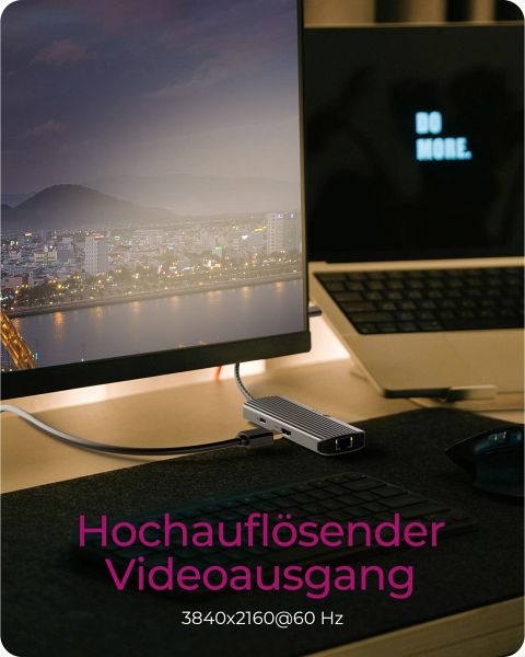 Die DockingStation bietet einen HDMI Videoausgang, der Auflösungen bis zu 4K@60 Hz unterstützt und abwärtskompatibel zu 2K und 1080p ist. Dadurch eignet sie sich für verschiedene Bildschirm- und Projektoranwendungen und sorgt für ein hervorragendes Seherlebnis.