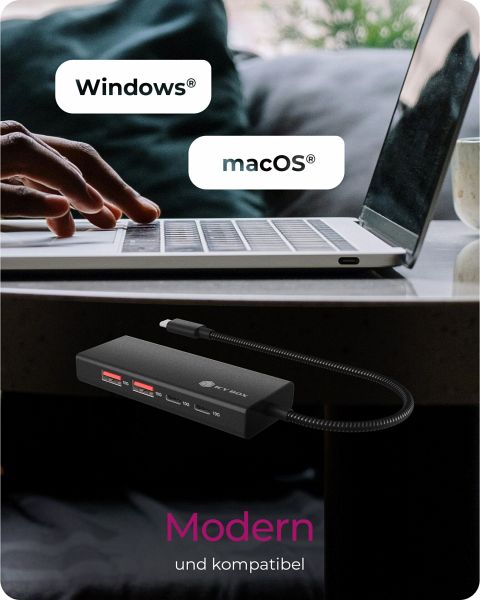 Die goldene Mitte der Schnittstellenwahl mit je zwei USB Type-C und zwei USB Type-A Anschlüssen macht diesen Hub so vielfältig in der alltäglichen Nutzung mit unterschiedlichen Endgeräten, die entweder den altbewährten A-Anschluss oder den modernen C-Anschluss aufweisen. Damit passt er ideal in Büro und Wohnzimmer.