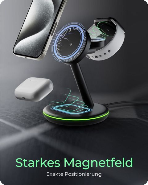 Das starke Magnetfeld ermöglicht eine einfache, präzise und sichere Positionierung des Smartphones auf der Ladefläche. Sobald das Gerät auf der Station liegt, startet der Ladevorgang umgehend, sicher und kabellos.