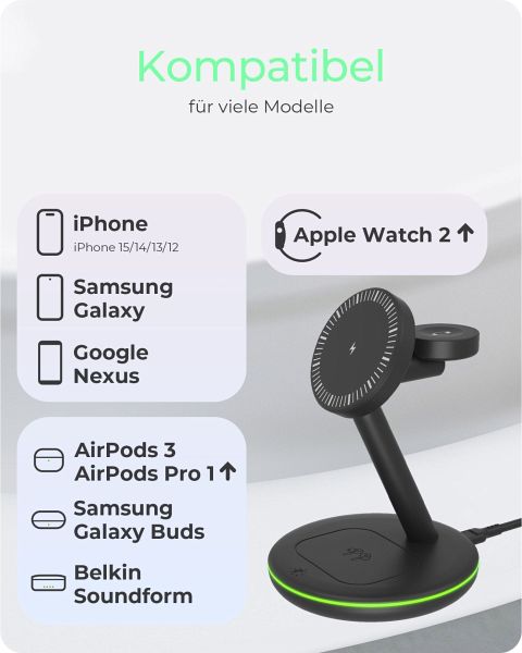 Die Ladestation ist kompatibel mit der iPhone 15/14/13/12 Serie, der Samsung Galaxy Serie, Google Nexus und Modellen anderer Smartphonehersteller sowie der Apple Watch ab Serie 2 aufwärts und vielen In-Ear Kopfhörer Ladehüllen ab AirPods Serie 2, Samsung Galaxy Buds, Belkin Soundform usw.