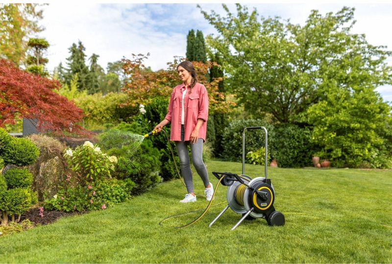 Der stabile und robuste Schlauchwagen ermöglicht eine platzsparende Aufbewahrung des Gartenschlauchs und ist sehr komfortabel in der Handhabung. Die robuste Metalltrommel hält auch höchsten Beanspruchungen im Garten stand. Durch die ergonomische Kurbel sowie die stabile Schlauchführung lässt sich der Schlauch zuverlässig aufrollen. Außerdem punktet der Schlauchwagen durch einen extra breiten Standfuß für höchste Standsicherheit und UV- wie auch Frostsicherheit. Mit den innovativen Schnellspannern kann der teleskopierbare Handgriff komfortabel auf die passende Höhe eingestellt oder auch komplett nach unten geschoben werden. Letzteres sorgt vor allem für eine platzsparende Verstauung. Das Set ist dank der mitgelieferten Zubehöre wie dem Kärcher Gartenschlauch, Kupplungen, Hahnadapter und Spritze sofort einsatzbereit. Der Schlauchwagen wird fertig montiert geliefert. Kärcher Schlauchaufbewahrungen zeichnen sich durch eine hohe Robustheit und Langlebigkeit aus.
