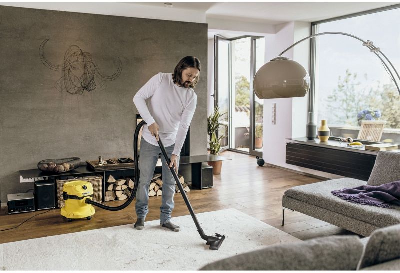 Der WD 3 V-17/4/20 ist saugstark und energieeffizient bei nur 1000 Watt Stromverbrauch. Dabei sind sowohl das Gerät als auch der Saugschlauch und die Clips-Bodendüse optimal aufeinander abgestimmt - für die besten Reinigungsergebnisse bei trockenem, nassem, feinem oder grobem Schmutz. Der Nass-/Trockensauger punktet mit seiner kompakten Bauweise und einem robusten 17-Liter-Kunststoffbehälter, 4 m Kabel, 2 m Saugschlauch und seinem Vliesfilterbeutel. Dank des einteiligen Patronenfilters ist das Aufsaugen von sowohl nassem als auch trockenem Schmutz ohne Filterwechsel möglich. Die Blasfunktion ist nützlich beim Reinigen von schwer zugänglichen Stellen. Die Aufbewahrung des Schlauchs erfolgt platzsparend durch das Einhängen am Gerätekopf. Das Kabel kann am Kabelhaken verstaut werden, Rohre und Bodendüsen am Bumper. Das "Pull & Push"-Verschlusssystem ermöglicht einfachstes Öffnen und Schließen des Behälters. Der Handgriff des Saugers kann abgenommen und das Zubehör direkt auf den Saugschlauch gesteckt werden. Ebenfalls clever: Auf der Fläche auf dem Gerätekopf können Werkzeuge oder Kleinteile abgelegt werden. Der ergonomisch geformte Tragegriff ermöglicht den komfortablen Transport.