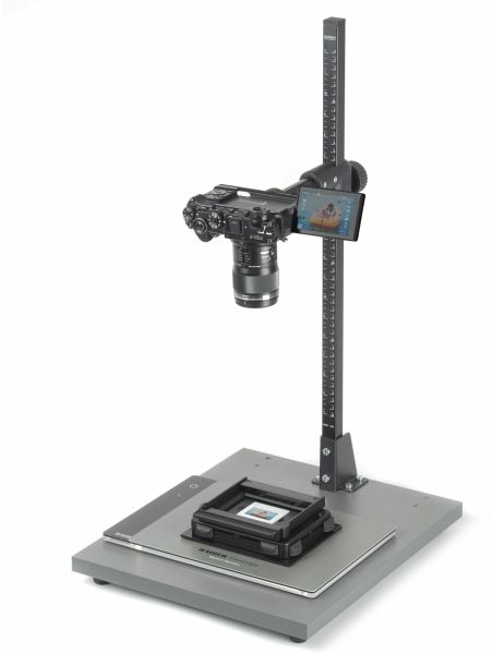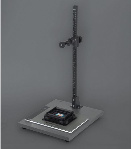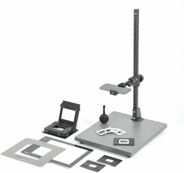 Komplettes Starter-Set zum Digitalisieren von Kleinbild-Dias und -Negativen mit dem eigenen Smartphone oder einer leichten Kamera mit Makroobjektiv (1:1). Umrüstbar für Filmformate bis 6 x 9 cm mit als Zubehör erhältlichen Formatmasken und Glaseinlagen.
