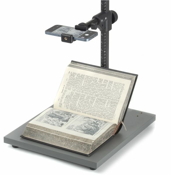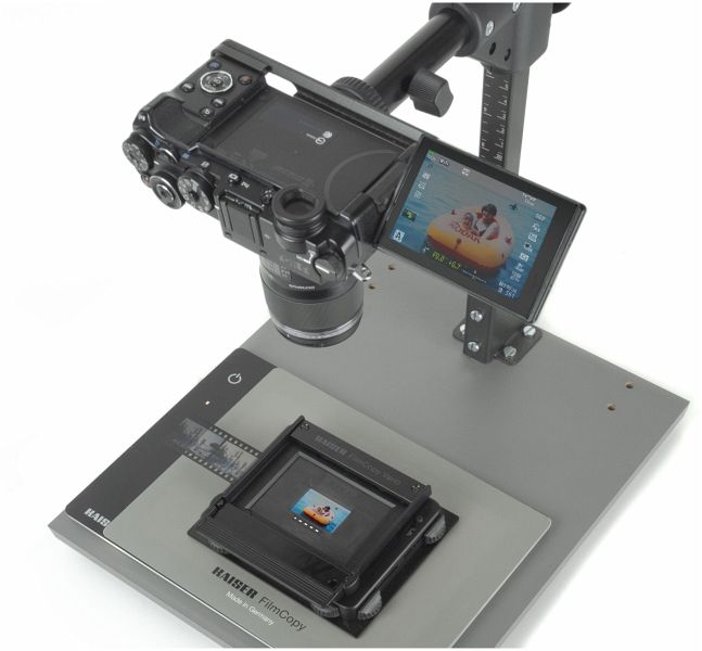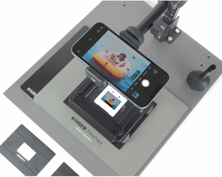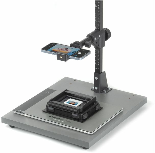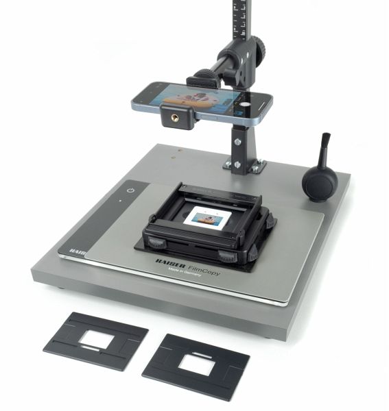 Haltevorrichtung FilmCopy Vario (2457), inkl. Formateinlage für Kleinbild-Dias (4489), Formatmasken 24 x 36 mm (4486) und Auflagematte sowie Leuchtplatte slimlite plano (2453) - Smartphone-Halter (6015)