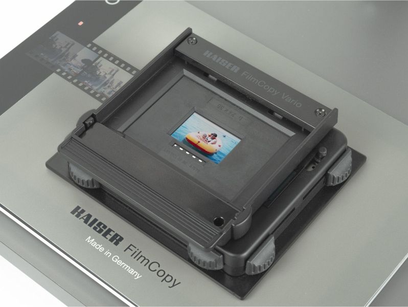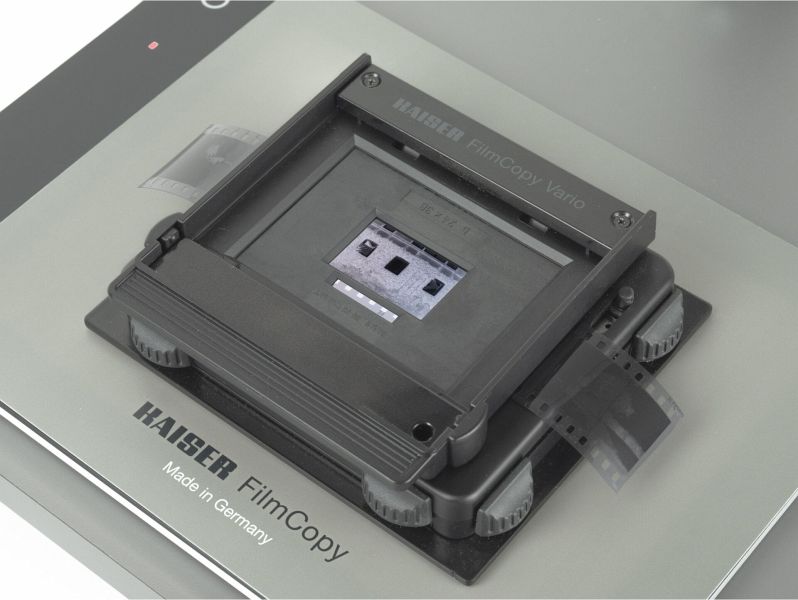Solide Haltevorrichtung zum exakten Positionieren von Dias und Negativen verschiedener Formate bei der Digitalisierung mit einem Smartphone oder einer Kamera mit Makroobjektiv (1:1) an einem Repro- oder Kamerastativ. Zur Verwendung auf Leuchtplatten. Inkl. Einlage für gerahmte Kleinbild-Dias in Rahmen 5 x 5 cm und Formatmasken 24 x 36 mm mit Führungsleisten für Kleinbild-Filmstreifen. Mit entsprechenden Formatmasken bzw. Glaseinlagen (jeweils optionales Zubehör) auch geeignet für Filmstreifen und geschnittene Einzeldias und -negative der Filmformate 4,5 x 6 cm, 6 x 6 cm, 6 x 7 cm, 6 x 9 cm und Kleinbild-Panorama 24 x 66 mm. Einfacher Wechsel der Einlagen. Gerahmte Kleinbild-Dias werden direkt von oben in den FilmCopy Vario eingelegt, zum Einlegen von Filmstreifen wird der Andruckrahmen nach oben geklappt. Unterteil mit verstellbaren Anschlagstiften für unterschiedliche Filmbreiten sowie vier stufenlos verschiebbaren Maskenbändern. Inkl. Auflagematte 254 x 201 mm zum Schutz vor Streulicht. Gewicht FilmCopy Vario (ohne Masken, ohne Auflagematte): ca. 600 g.
