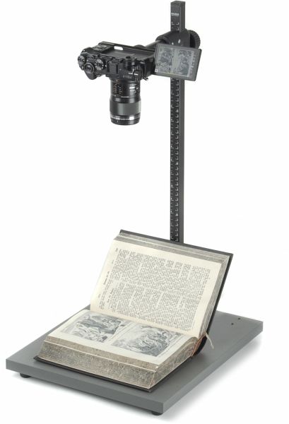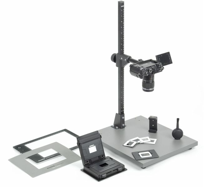 Bestehend aus dem kompakten Reprostativ reprokid zur Befestigung einer leichten Kamera oder des mitgelieferten Smartphone-Halters, der Haltevorrichtung FilmCopy Vario mit einer Einlage für gerahmte Dias im Außenformat 5 x 5 cm, austauschbar gegen Formatmasken 24 x 36 mm und der LED-Leuchtplatte slimlite plano als Durchlichtquelle, mit einer Auflagematte zur Randabdeckung. Zusätzlich ist noch ein Luftpinsel zur schonenden Reinigung der Dias und Negative im Set enthalten.