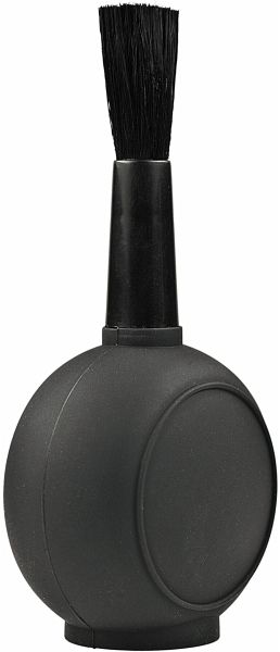 Kleiner Rundpinsel mit Silikonblasebalg. Mit Standfläche zum Aufstellen. Länge: ca. 10 cm, Tiefe: ca. 3,3 cm, Balg-Durchmesser: ca. 5 cm.