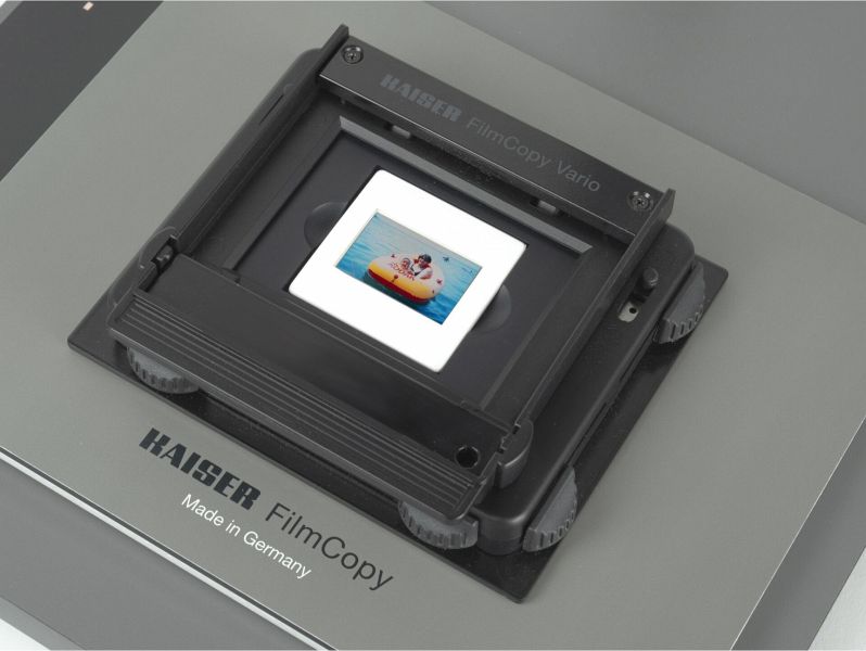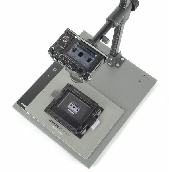 Zur Digitalisierung von Mittelformat-Dias 4,5 x 6 cm und 6 x 6 cm in Rahmen mit Außenformat 7 x 7 cm eignet sich die Haltevorrichtung FilmCopy dia MF, Art.-Nr. 2459.