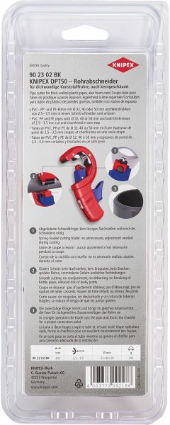 Der KNIPEX Rohrabschneider DP50 ist ein präzises Werkzeug für das Schneiden und Anfasen von Kunststoff-Abflussrohren bis 50 mm Durchmesser. Dank gleitgelagerter Rollen und selbsteinstellender Führung ermöglicht er eine mühelose Handhabung. Die Wendeklinge sorgt für einen sauberen Schnitt ohne Nachbearbeitung und ist werkzeuglos wechselbar.