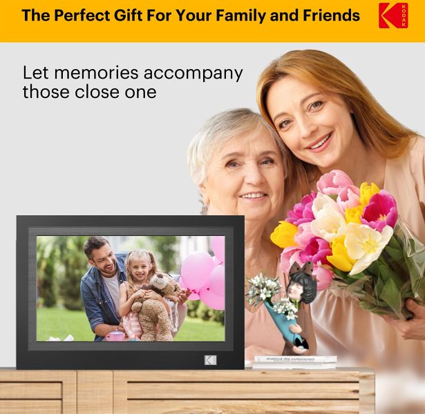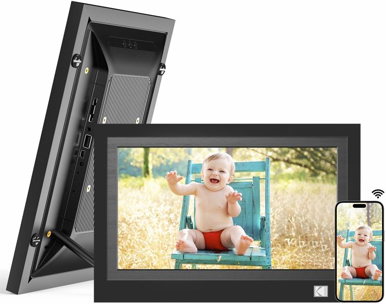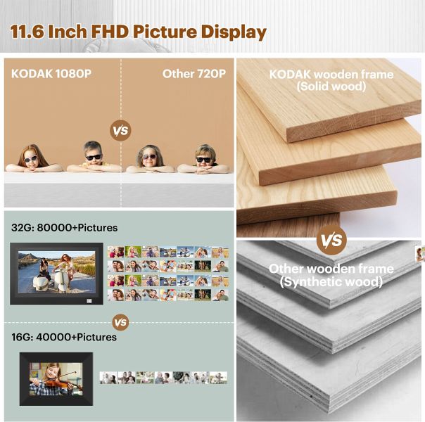 Der digitale Bilderrahmen Kodak RWF-116B WiFi im stylischen Holzdesign mit 11,6 Zoll Full HD IPS-Display kann Fotos, Musik und Videos vom eingebauten 32 GB Speicher, von SD-Speicherkarten und USB-Sticks wiedergeben und lässt sich per Touchscreen leicht bedienen. Mit der Kodak App können Sie per Wi-Fi vom Smartphone oder Tablet Ihre Lieblingsbilder leicht auf den Bilderrahmen schicken.
