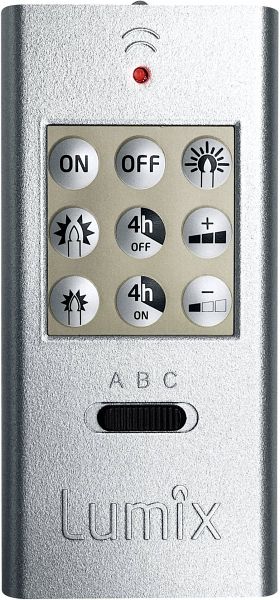 - Die Lumix SuperLight Infrarot-Fernbedienung bietet Ihnen besonderen Komfort. Ganz nach Ihren individuellen Wünschen können Sie beliebig viele Lumix-Kerzen auf nur einen Kanal legen und gleichzeitig ein- und ausschalten, oder bis zu drei verschiedene Lumix-Produkte mittels Kanalwahlschalter (A/B/C) getrennt voneinander bedienen.
