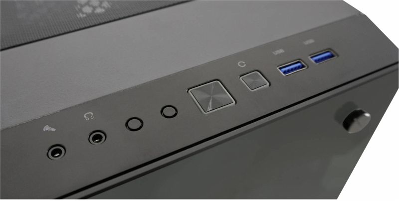Das auf der Oberseite des Gehäuses eingearbeitete I/O-Panel enthält eine Power- und Reset-Taste sowie zwei USB 3.0-Ports. Zusätzlich finden sich dort der HD-Audio Ein- und Ausgang, um entsprechende Audiogeräte ganz bequem nutzen zu können.