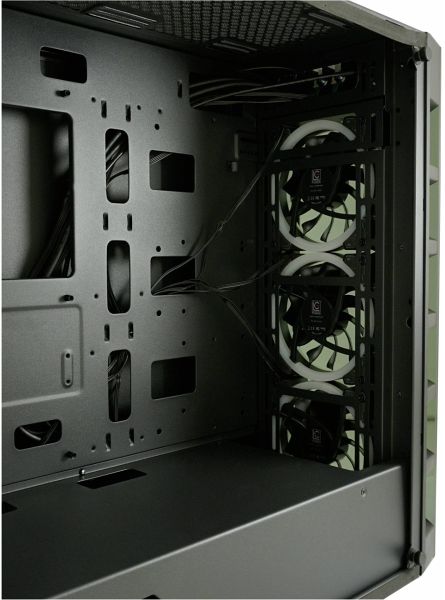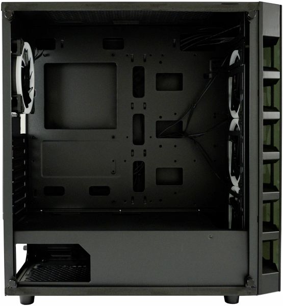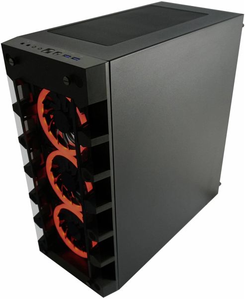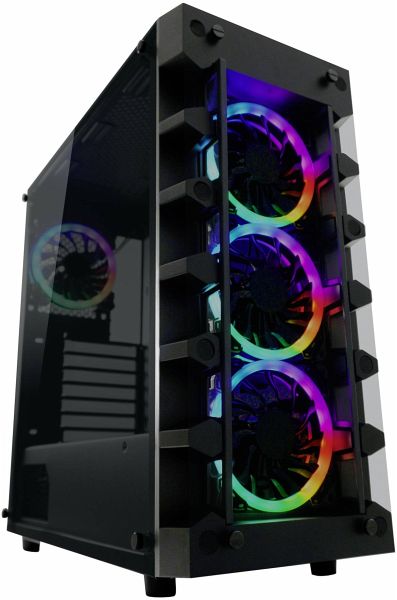 Mit dem getönten Hartglas-Frontpanel sowie vier bereits integrierten 120mm-RGB-Gehäuselüftern wird ab Werk ein besonderer Blickfang geboten. Die gewünschte Farbe kann ganz einfach per Fernbedienung oder durch die RGB-Mainboard-Software eingestellt werden. Wer etwas mehr Farbe in sein System bringen will, kann durch die getönte Seitenscheibe aus Hartglas das Innere des PCs ästhetisch zum Vorschein bringen.