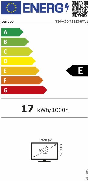 Marke: LenovoModellkennung: T24v-30(F22238FT1)Energieeffizienzklasse von A (höchste Effizienz) bis G (niedrigste Effizienz): ELeistungsaufnahme im Ein-Zustand (kWh/1000h): 17Energieeffizienzklasse im HDR-Modus von A (höchste Effizienz) bis G (niedrigste Effizienz): -Leistungsaufnahme im Ein-Zustand im HDR-Modus (kWh/1000h): -Sichtbare Bildschirmdiagonale (cm): 61Sichtbare Bildschirmdiagonale (Zoll): 24Bildschirmauflösung (Pixel): 1920 x 1080