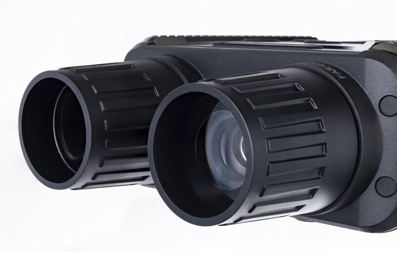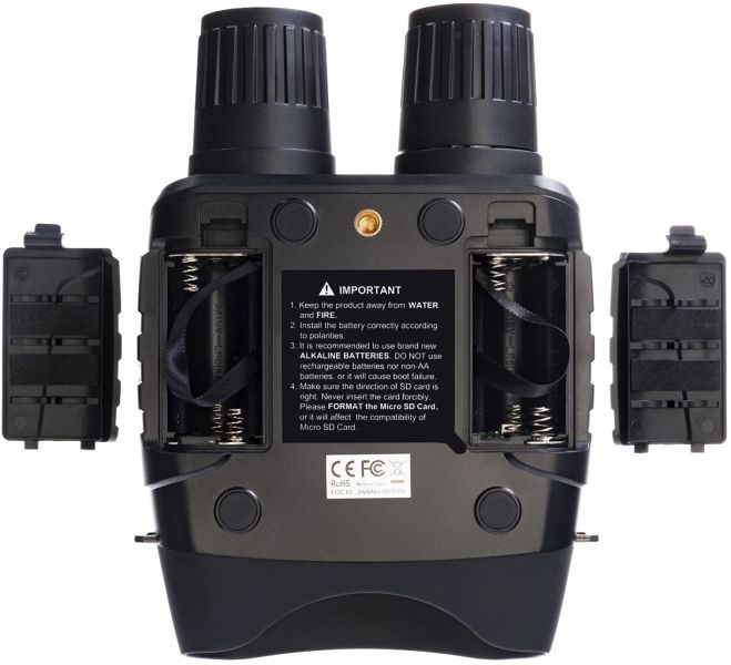 Elektronik und Optik sind in einem ergonomischen, tropfwasserdichten Gehäuse mit einer rutschfreien Oberfläche untergebracht. Dadurch liegt das Fernglas bequem in der Hand. Wenn Sie es ergreifen, befinden sich die Bedientasten direkt unter Ihren Fingern. Das Gerät ist benutzerfreundlich, und die Navigation durch das Menü ist sehr komfortabel. Das Nachtsicht-Fernglas wird mit handelsüblichen AA-Batterien betrieben. Es empfiehlt sich, einen zusätzlichen Satz mitzuführen, damit sich das Gerät nicht im unpassendsten Moment ausschaltet. Ein Satz Batterien reicht für 4-10 Stunden Dauerbetrieb. Die Lebensdauer der Batterien hängt von der Intensität der Hintergrundbeleuchtung ab.