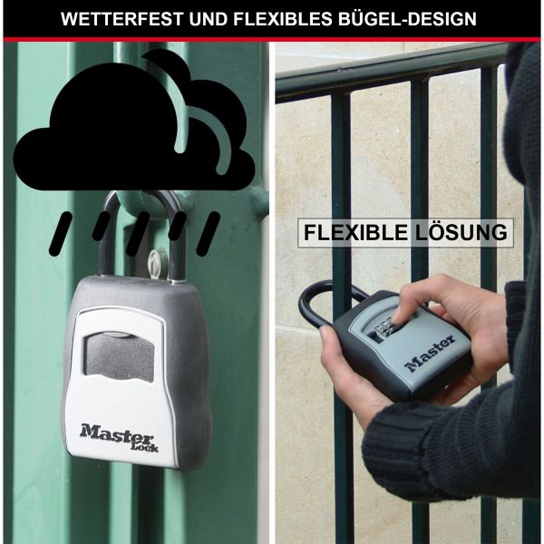 Der Select Access Schlüsselkasten Nr. 5400EURD von Master Lock mit Bügel verfügt über ein 90 mm breites, robustes Metallgehäuse und eignet sich zur Aufbewahrung von mehreren Hausschlüsseln. Verstecken Sie Ihre Schlüssel nicht mehr unter der Fußmatte oder unter dem Blumentopf: Select Access ist die perfekte Lösung, um anderen den Zugang zu Ihren Schlüsseln zu ermöglichen. Kann durch das mobile Design an verschiedenen Orten angebracht werden. Schlüsselloser Komfort und mehr Sicherheit durch individuell einstellbare, 4-stellige Kombination. Eine Türklappe schützt die Einstellräder vor Witterungsbedingungen, Schmutz und Dreck; das geformte Gehäuse sowie der vinylbeschichtete Bügel schützen vor Kratzern.