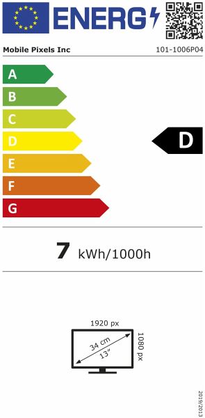 EU-Datenblatt: nach Verordnung (EU) Nr. 2019/2013Marke: Mobile PixelsModellkennung: 101-1006P04Energieeffizienzklasse von A (höchste Effizienz) bis G (niedrigste Effizienz): DLeistungsaufnahme im Ein-Zustand (kWh/1000h): 7Energieeffizienzklasse im HDR-Modus von A (höchste Effizienz) bis G (niedrigste Effizienz): -Leistungsaufnahme im Ein-Zustand im HDR-Modus (kWh/1000h): -Sichtbare Bildschirmdiagonale (cm): 34Sichtbare Bildschirmdiagonale (Zoll): 13Bildschirmauflösung (Pixel): 1920 x 1080