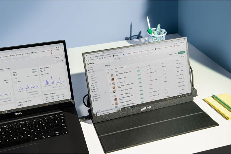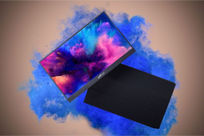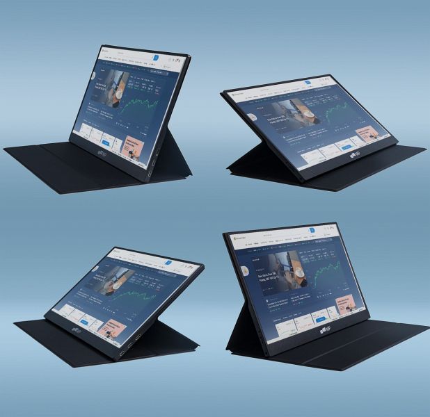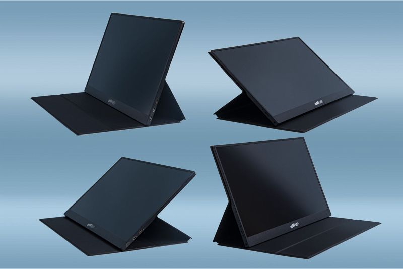 Der Monitor ist ultraflach mit nur 6 Millimetern Tiefe und wiegt lediglich 720 Gramm, wodurch er sich problemlos transportieren lässt. Eine robuste magnetische Abdeckung schützt den Bildschirm beim Transport vor Kratzern und Feuchtigkeit und dient gleichzeitig als flexibler Standfuß mit zwei stabilen Betrachtungswinkeln. Für Audio sorgt ein integriertes Dual-Stereosystem mit zwei Lautsprechern (je 1 Watt), zusätzlich ist eine 3,5-Millimeter-Kopfhörerbuchse vorhanden.