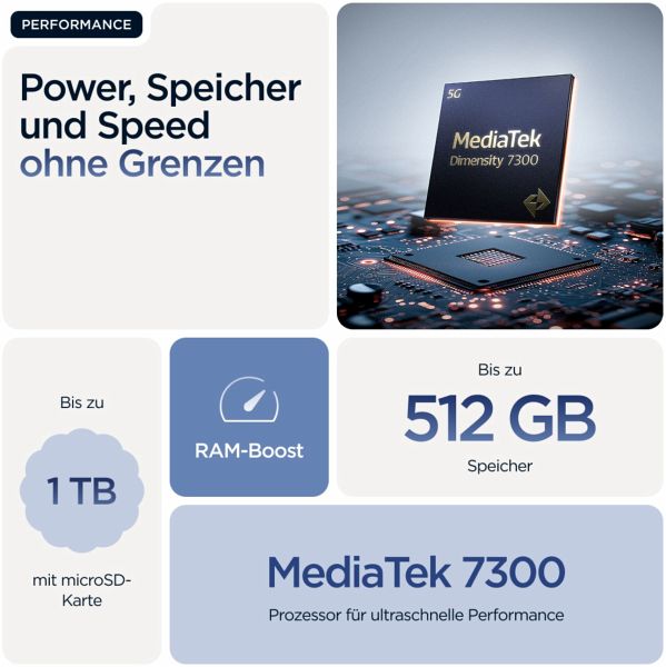 Prozessorbezeichnung: MediaTek Dimensity 7300Prozessorkerne: 8 (Octa Core)Taktfrequenz (GHz): 4x 2,5 + 4x 2,0Arbeitsspeicher / RAM (GB): 12NPU (KI-Beschleunigung): Ja