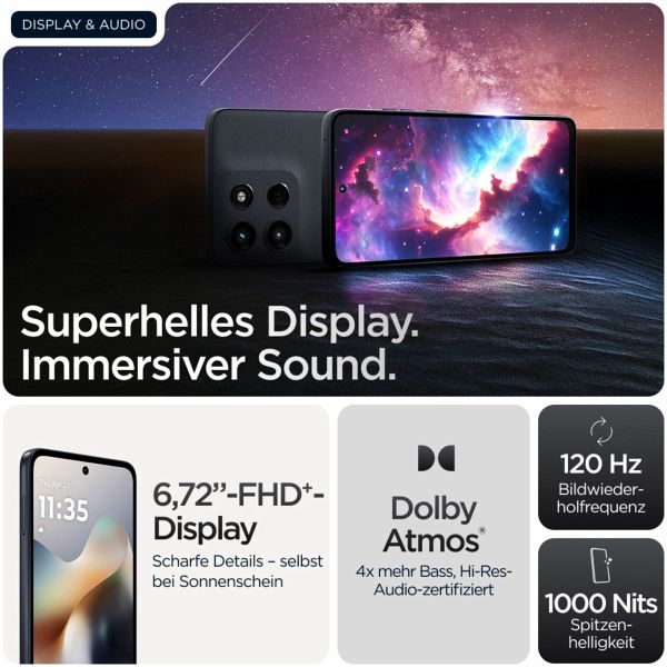 Das 6,72 Zoll-Display im Format 20:09 bietet dir eine beeindruckende Bildqualität mit einer Auflösung von Full HD+ (2400 x 1080) und 391 ppi. Die LCD-Technologie mit einer Bildwiederholfrequenz von 120 Hz und Corning Gorilla Glass 7i3 sorgt für klare und lebendige Bilder. Mit einem Display-Gehäuse-Verhältnis von 87% kannst du deine Inhalte in voller Pracht genießen.