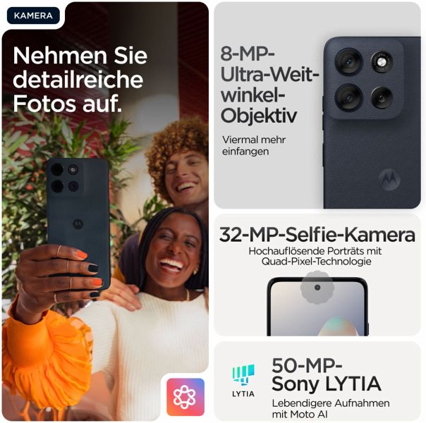 Mit einem internen Speicher von 256 GB, der per microSD(TM)-Karte um bis zu 2 TB erweitert werden kann, hast du genügend Platz für all deine Daten. Der 8 GB RAM, erweiterbar mit RAM-Boost auf bis zu 24 GB, sorgt für eine flüssige Nutzung und Multitasking. Angetrieben wird das Smartphone von einem MediaTek Dimensity 7060-Prozessor mit 2,6-GHz-Octa-Core-CPU und IMG BXM-8-256-GPU, was dir eine schnelle und reibungslose Performance bietet.