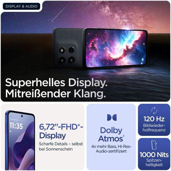 Das 6,72 Zoll-Display im Format 20:09 bietet dir eine beeindruckende Bildqualität mit einer Auflösung von Full HD+ (2400 x 1080) und 391 ppi. Die LCD-Technologie mit einer Bildwiederholfrequenz von 120 Hz und Corning Gorilla Glass 7i3 sorgt für klare und lebendige Bilder. Mit einem Display-Gehäuse-Verhältnis von 87% kannst du deine Inhalte in voller Pracht genießen.