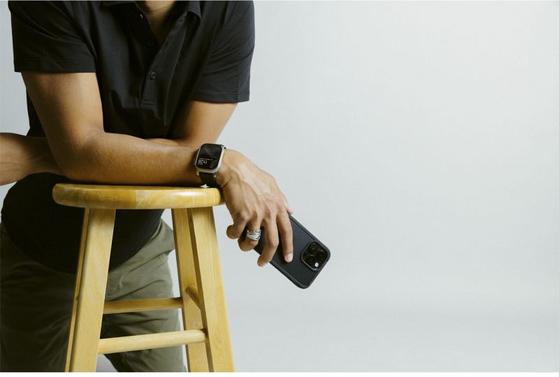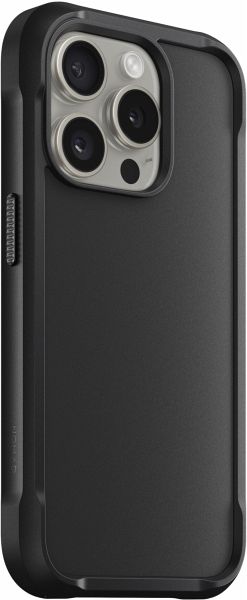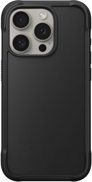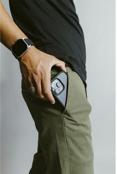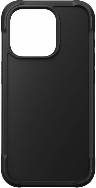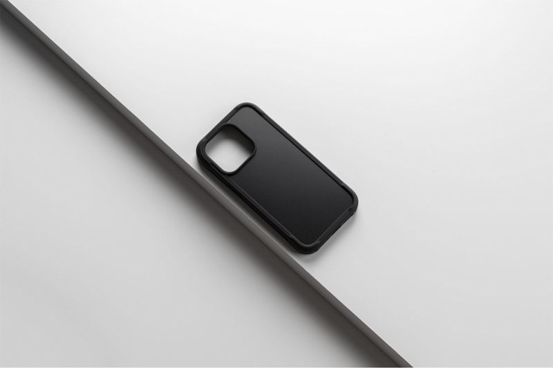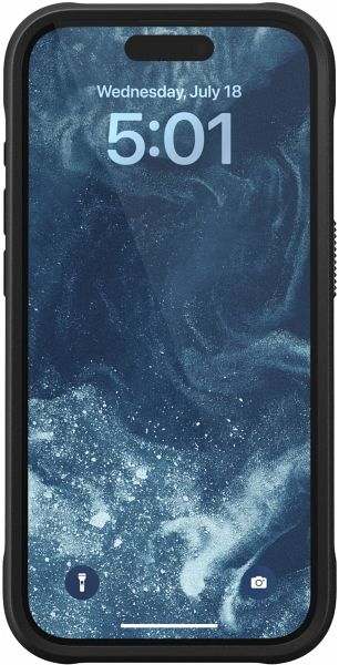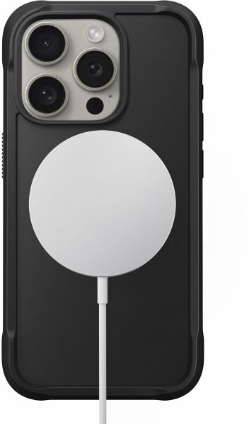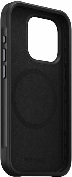 Das robuste und widerstandsfähige Nomad Rugged Case schützt das iPhone durch einen Rahmen aus Polycarbonat, erhöhten Rändern zum Schutz des Displays und Bumpern an den Ecken des Smartphones zuverlässig bei Stürzen aus bis zu 4.5 Metern Höhe. Die matte Rückseite aus PET liegt angenehm und sicher in der Hand während die eloxierten Aluminiumtasten und die Textur des Polycarbonat Rahmens für besonderen Grip sorgen. Dank der vom restlichen Case hervorragenden Bumper an den Ecken liegt das iPhone trotz der erhöhten Kamera flach auf. Trotz des umfassenden Schutzes verfügt die Hülle über einen schlanken, minimalistischen Look. Dank der integrierten, starken Magnete ist sie außerdem mit beliebigem MagSafe-Zubehör kompatibel.