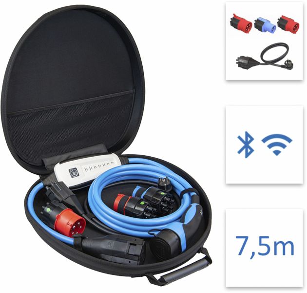 32A/22kW, Typ 2, 7,5m, WLAN + Bluetooth inkl. Steckeraufsatz 32A 5Pol, 16A 5Pol, 16A 3Pol, Typ E+F "Schuko" 13A (EU) und Transporttasche