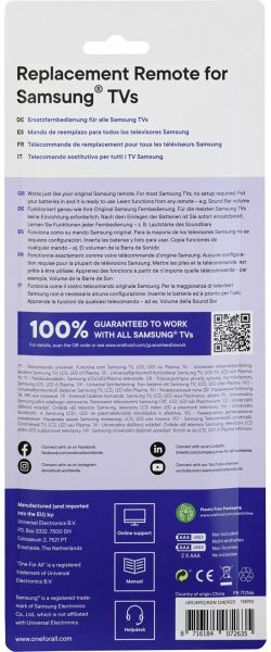 Universelle One for All Ersatzfernbedienung, passend für Ihren Samsung TV. Keine Einrichtung erforderlich. Unterstützt alle gängigen Samsung Funktionen.