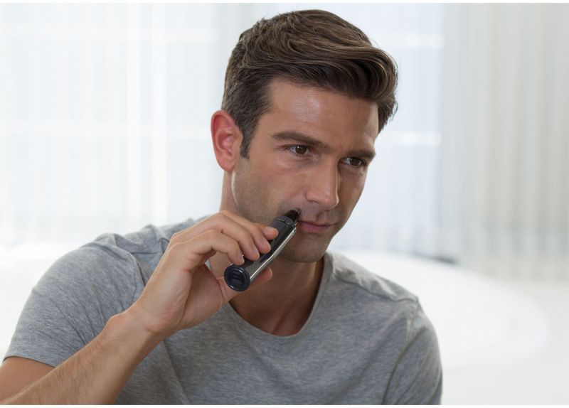 - Schneidet Haare in Nase, Ohren, an Augenbrauen und Nacken