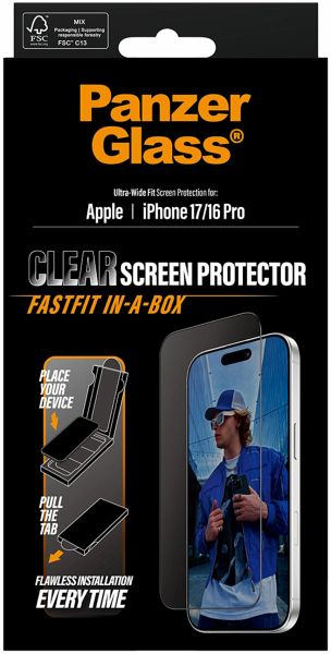 PanzerGlass Displayschutz mit schwarzem Rahmen für iPhone 16 Pro und 17